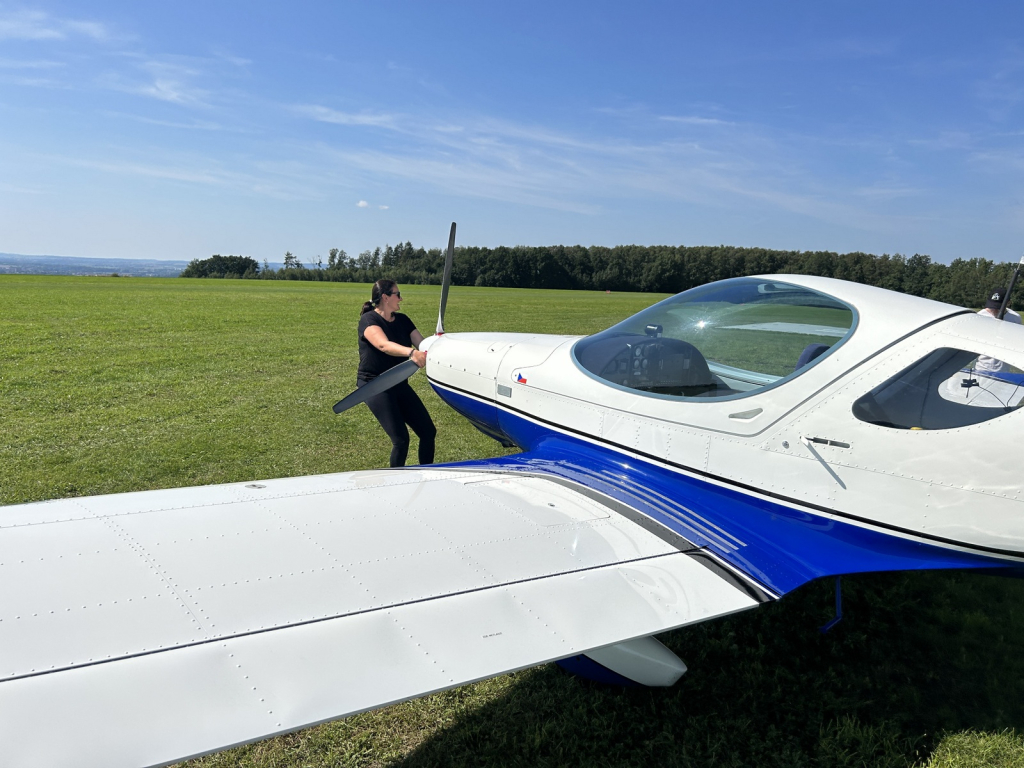 - Pilotka právě roztáčí motor Robinsona 44 Turbo