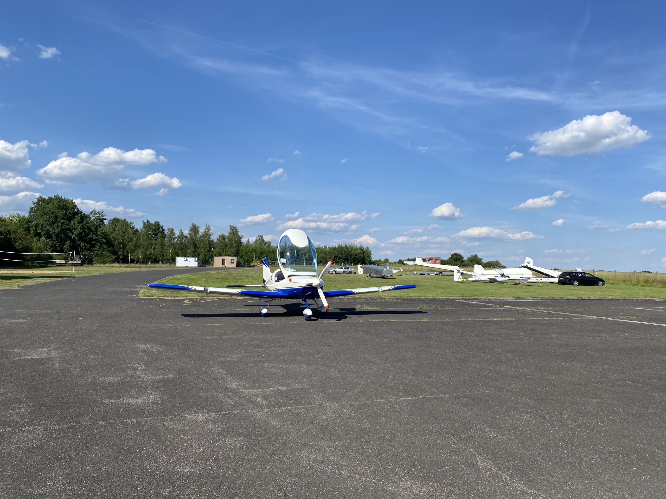 tak už bylo slyšet jen Ja, Ja. Dráha parádní, pokosená a uválcovaná skoro jak na Vysokově, po dosednutí mi ukázali kam mám odstavit letadlo a kam přijít. Zaplatil jsem 5 Eur přistávací poplatek, strejci na letišti byli naprosto v pohodě, ale nikdo ani slovo anglicky. Po zaplacení poplatku mi nabidli kafe a vodu. Vytáhl jsem překladač a chvíli jsme se bavili tak, že jsme si podávali telefon, bylo to fajn, docela jsme se nasmáli. Asi po půl hodince jsem poděkoval a vyrazil zpět k domovu. Takže, bylo to na pohodu. Jak říkal tatíček Masaryk „nebát se a nekrást“ a ono to nějak dopadne :-).